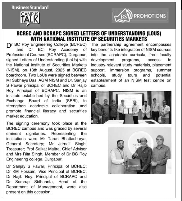 Dr. B. C. Roy Engineering College (BCREC), Durgapur, has entered into a landmark partnersh